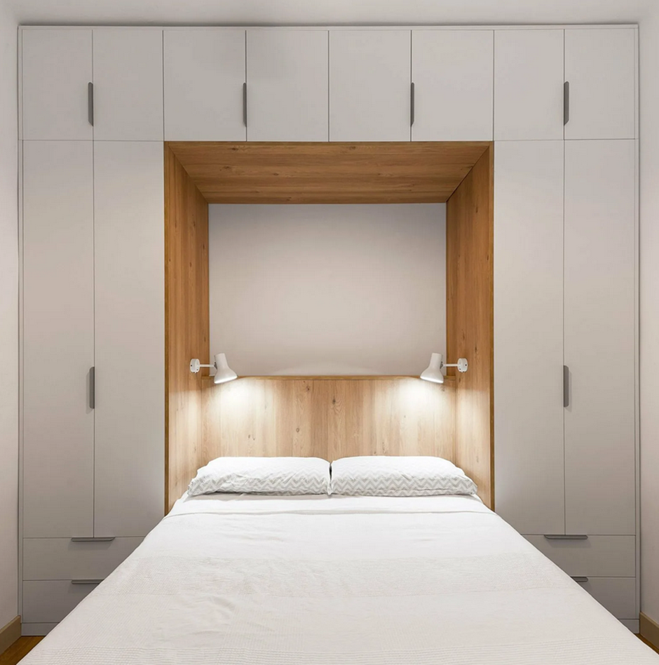 - единый цвет стен и мебельных фасадов позволит визуально удлинить стену, что особенно актуально в небольших спальнях;