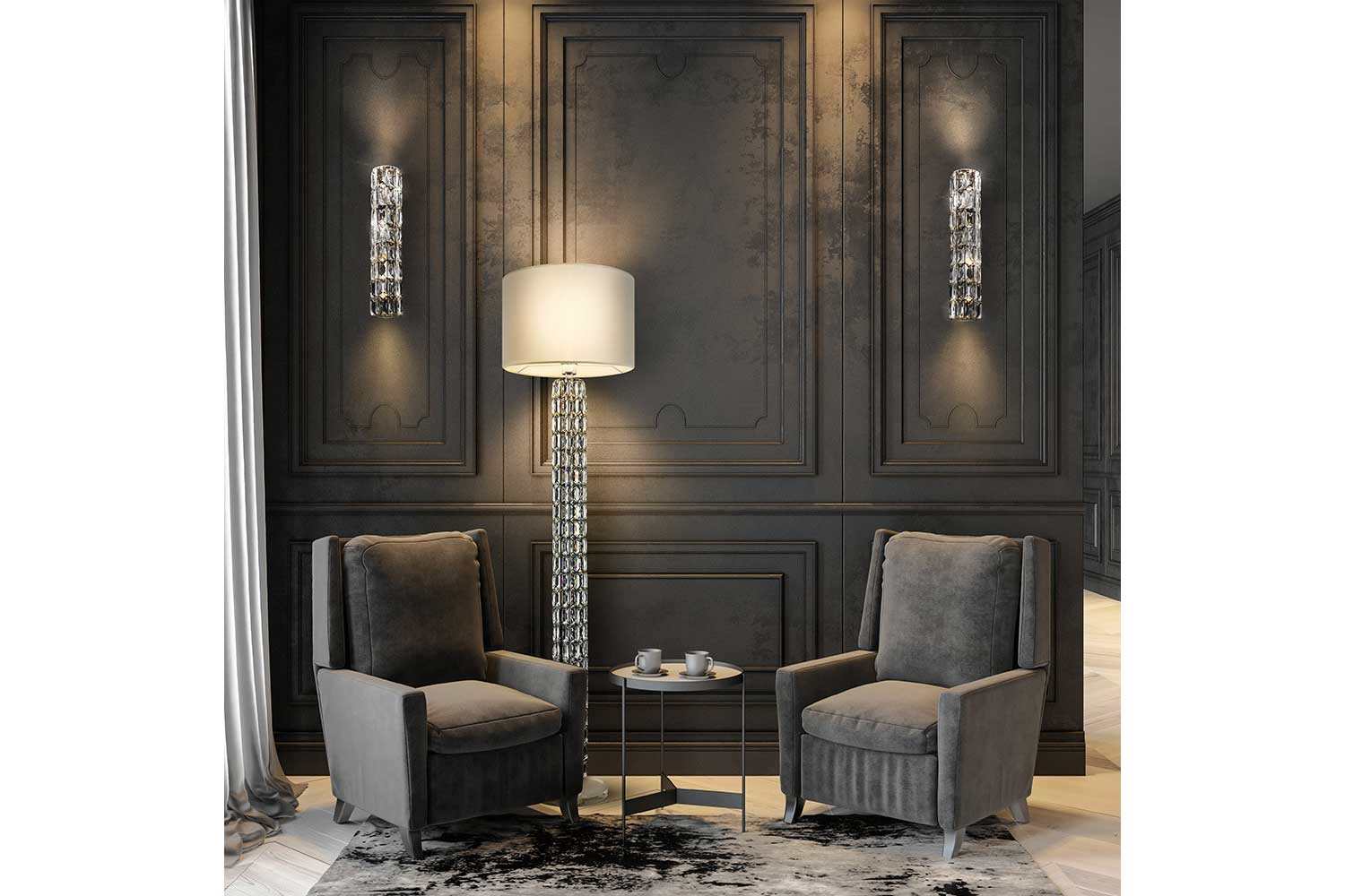 Подвески из массивных граненых кристаллов на рожках и в основании делают серию Talento непохожей на других. Арматура изготовлена из металла с хромированным покрытием. Абажуры сделаны из белой ткани, нанесенной на ПВХ.