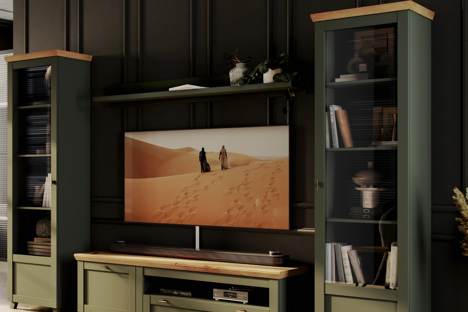 Модульная коллекция мебели Эмили, представленная возможностью создания разнообразных композиционных решений, выполнена в цвете Олива (корпус, фасады) и Таксония (крышка).
