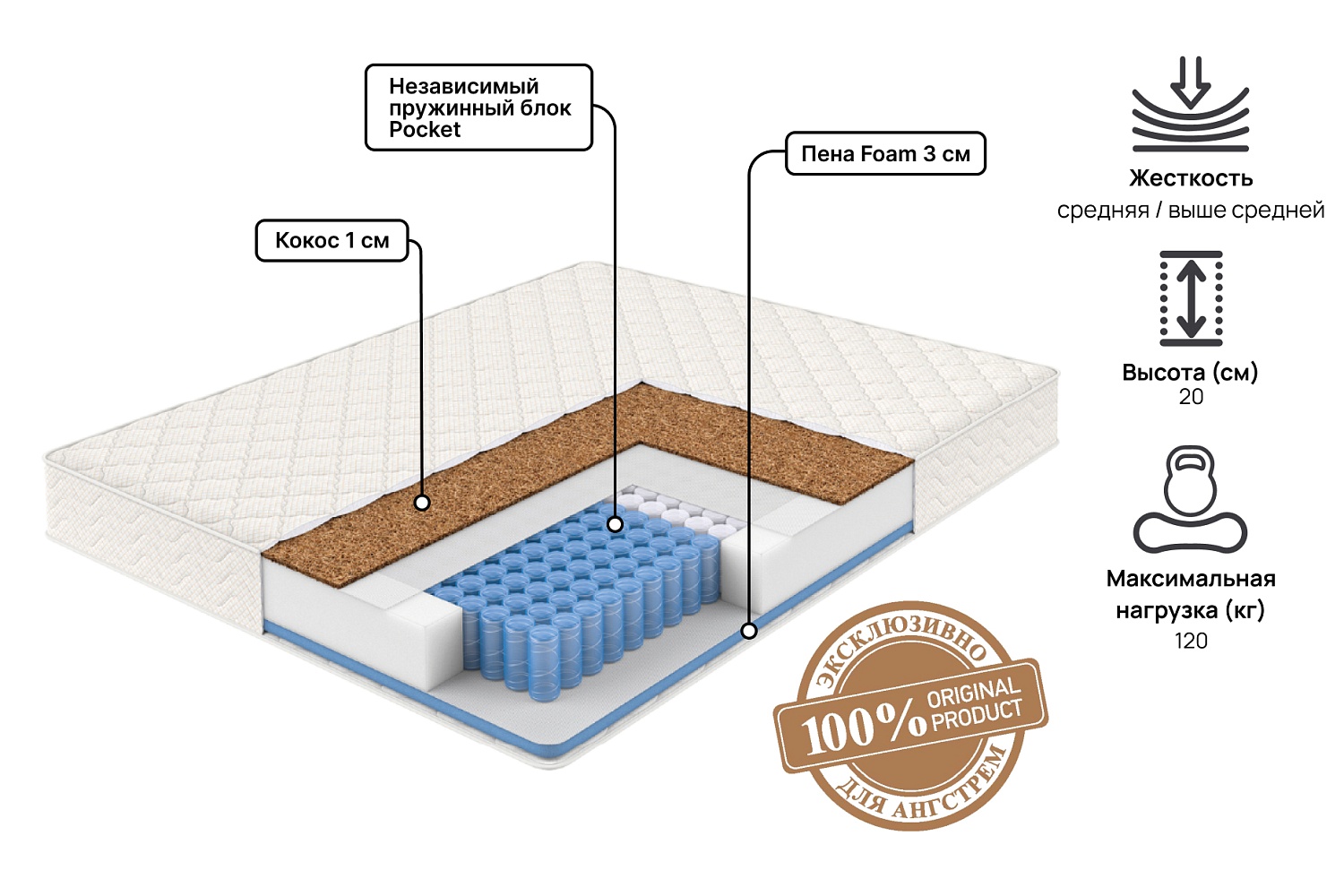 Разносторонний матрас Free выполнен на основе блока независимых пружин Pocket, плотностью 512 пружин на спальное место, снимает нагрузку с позвоночника и качественно поддерживает область поясницы. Кокосовая койра обеспечивает жесткость, а гипоаллергенный материал Foam повторяет естественные изгибы тела и обеспечивает жесткую опору. Мягкий чехол из трикотажа, простеганный на объемном синтепоне, создает комфортные условия для сна.