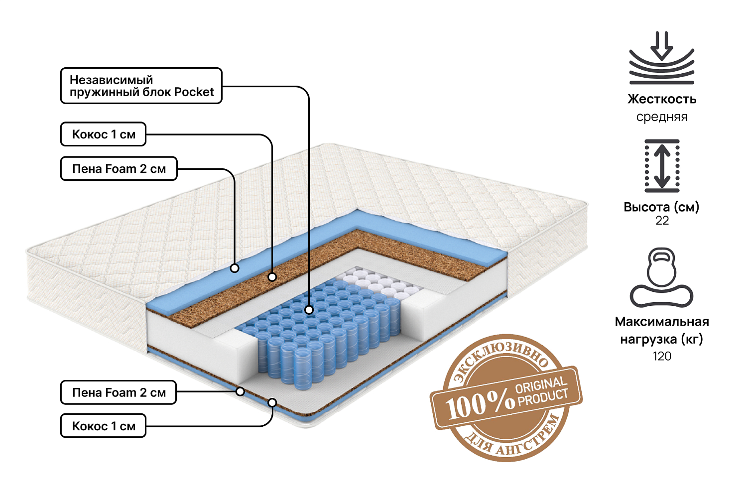 Матрас Smart выполнен на основе блока независимых пружин Pocket, плотностью 512 пружин на спальное место, снимает нагрузку с позвоночника и качественно поддерживает область поясницы. Кокосовая койра обеспечивает жесткость, а гипоаллергенный материал Foam повторяет естественные изгибы тела и обеспечивает жесткую опору. Чехол матраса изготовлен из практичного трикотажа в современном дизайне.